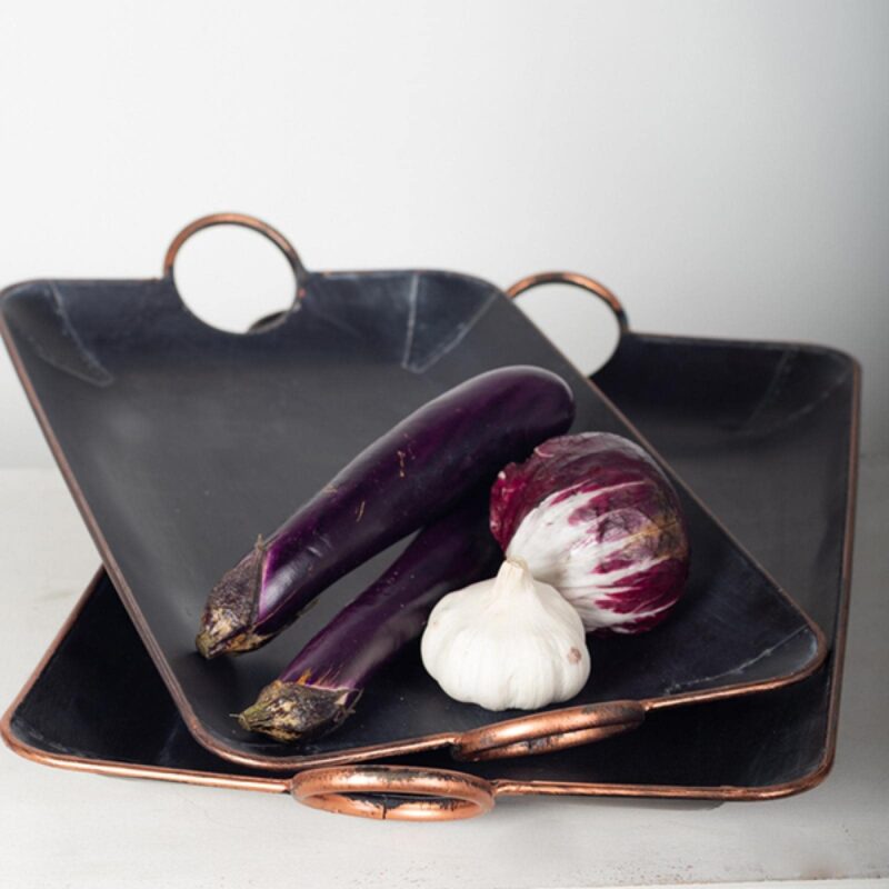 Set Of 2 Rectangular Black Metal With Copper Color Trim And Handles Decorative Trays
